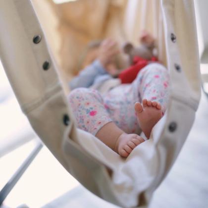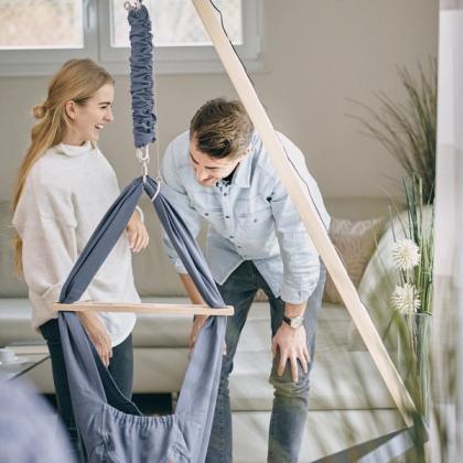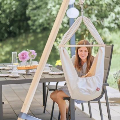 Dank der verschiedenen Aufhänge-Möglichkeiten ist man bei der Platzierung flexibel. - Wir verwenden ausschließlich sehr hochwertige Materialien. Unsere Stoffe sind auf Schadstoffe geprüft und durch das Ökotex-Label zertifiziert. Der Stoff des Wiegensacks ist mit 300g/qm deutlich reißfester als bei vielen anderen – dank der erstklassigen Verarbeitung ist er formstabil und trotzdem anschmiegsam. Das verwendete Esche-Holz kommt aus dem Schwarzwald und wird dort auch regional verarbeitet. Der Matratzenbezug kann einfach abgezogen und gewaschen werden.
