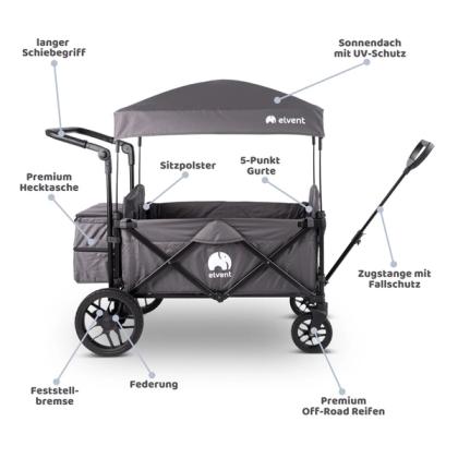 Der kostengünstigste elvent Bollerwagen ist das Zweisitzer-Einsteigermodell. Gegen einen geringen Aufpreis sind Sitzpolster, eine Aufbewahrungstasche und ein Dach erhältlich.Wo kann man einen Bollerwagen erwerben?
