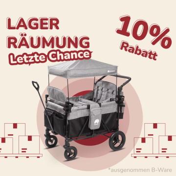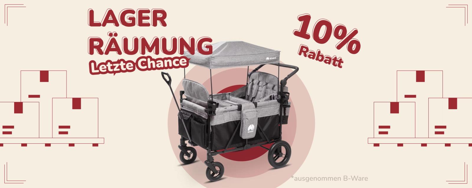 Der günstigste Bollerwagen von elvent ist der Zweisitzer, unser Einsteigermodell. Für nur wenige Euro mehr bekommst du den mit Sitzpolstern und praktischer Aufbewahrungstasche am Heck. Ein Dach ist auch mit dabei.