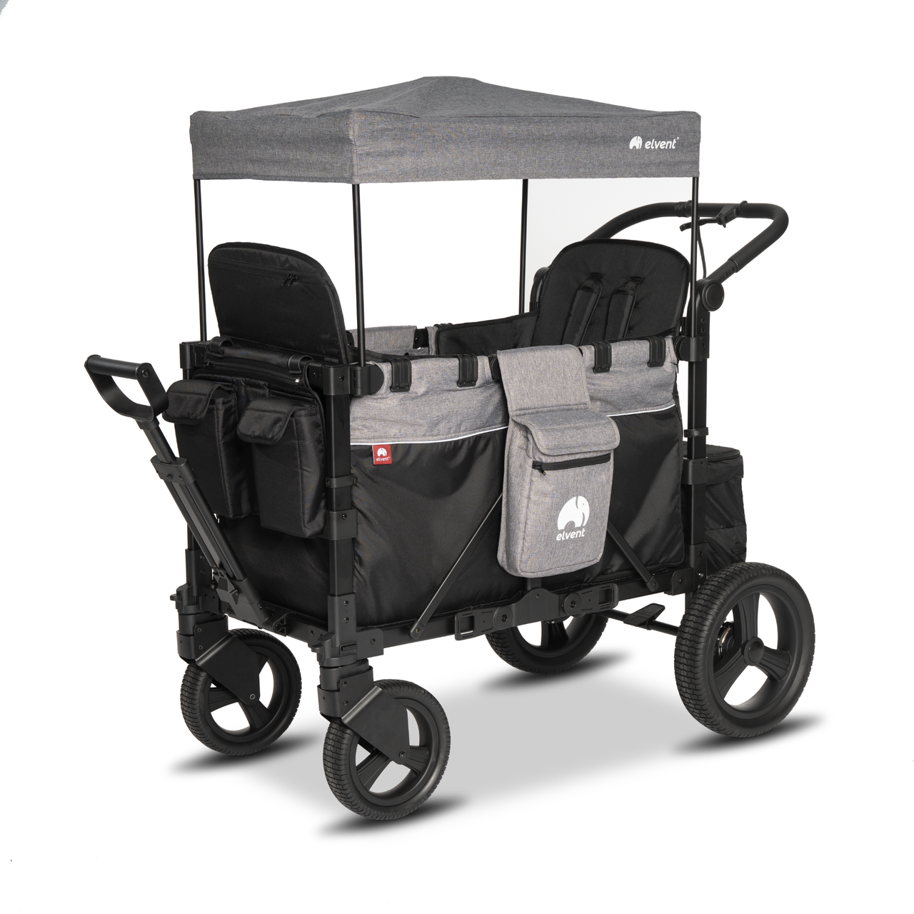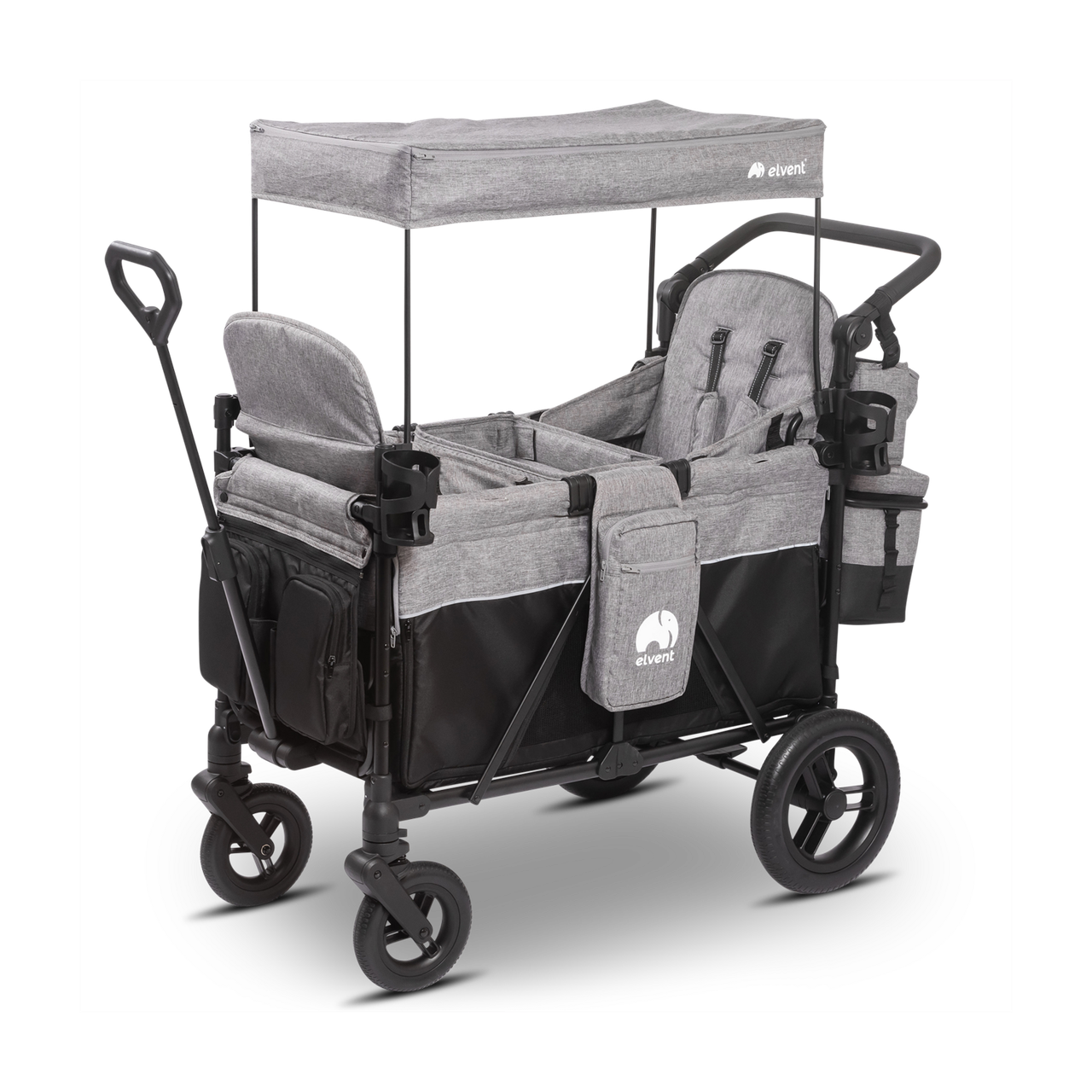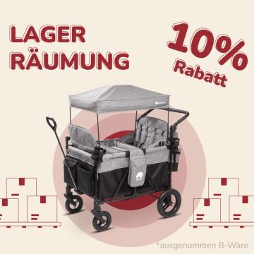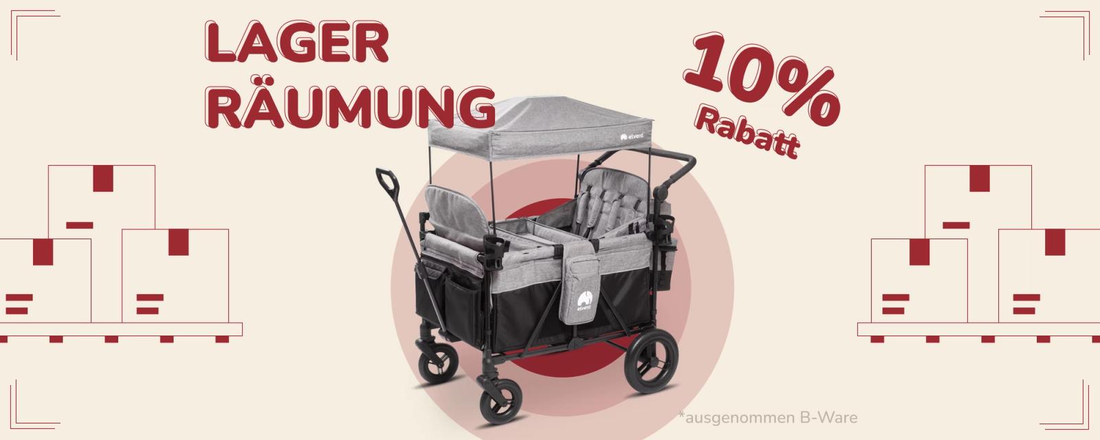 Der günstigste Bollerwagen von elvent ist der Zweisitzer, unser Einsteigermodell. Für nur wenige Euro mehr bekommst du den mit Sitzpolstern und praktischer Aufbewahrungstasche am Heck. Ein Dach ist auch mit dabei.